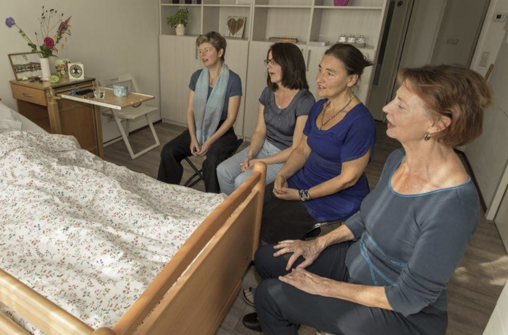 Bedside Singers zingen voor mensen in hun laatste levensfase. Ze komen 1 x per maand met 3 of 4 zangers langs op ons hospice en zingen rustgevende liedjes. Zacht en met aandacht, als een warm klankbad. Zo bieden ze ruimte voor ontspanning en bezinning in de laatste fase van het leven.